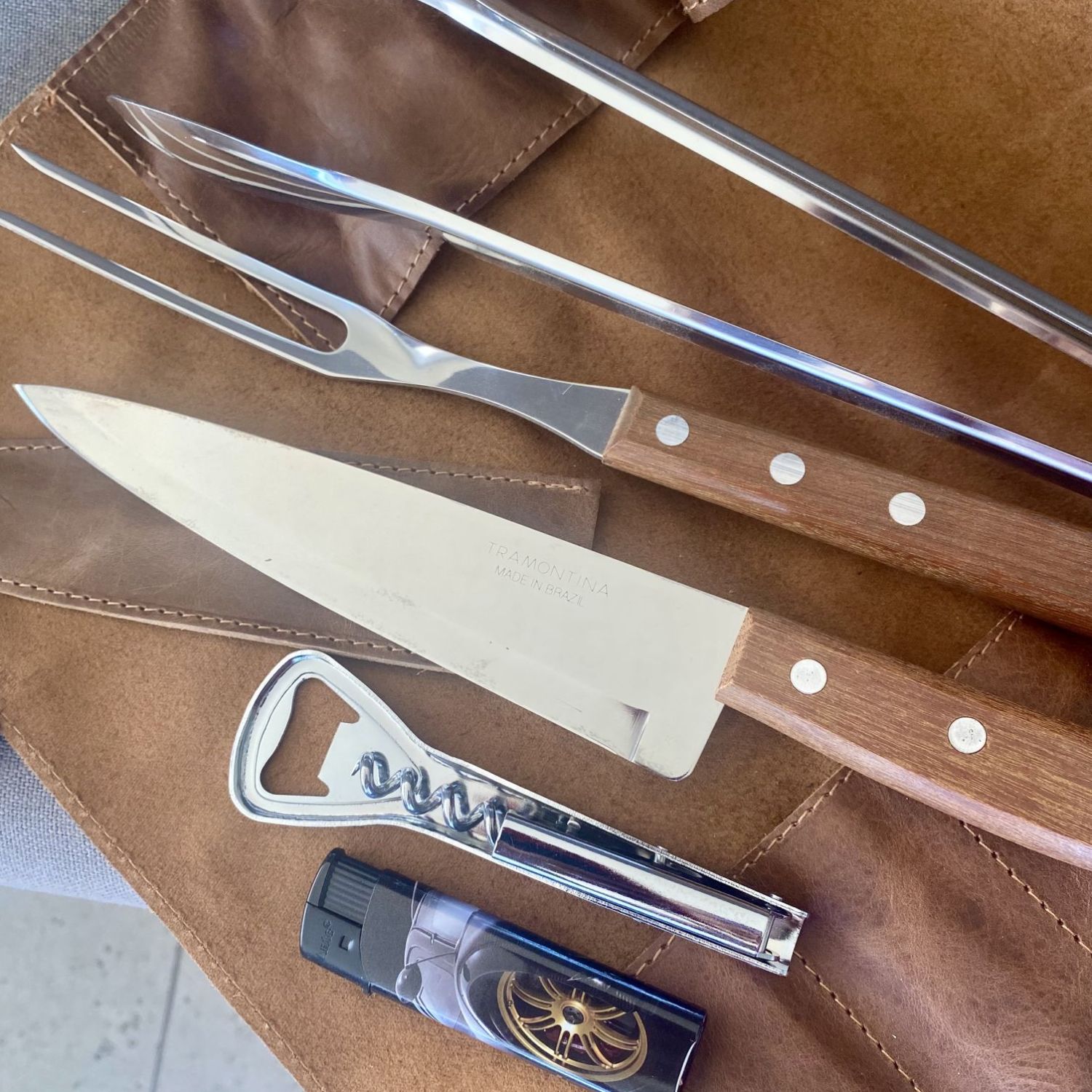Encendedor, Abre cervezas y abre vinos, tenazas, cuchillo y tenedor de asador